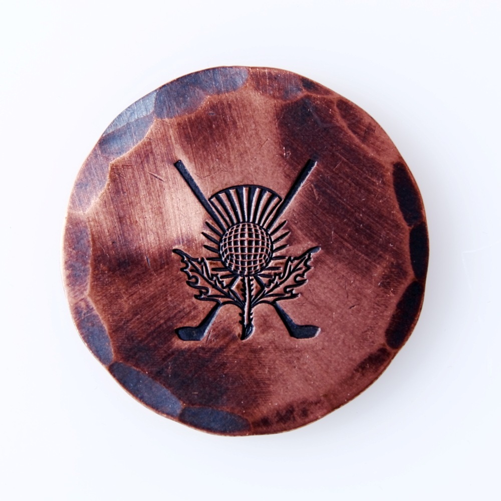 コインタイプのマーカーの中央部にはゴルフのクラブとゴルフ発祥の地、スコットランドの国花・あざみの模様を刻印してもらいました。