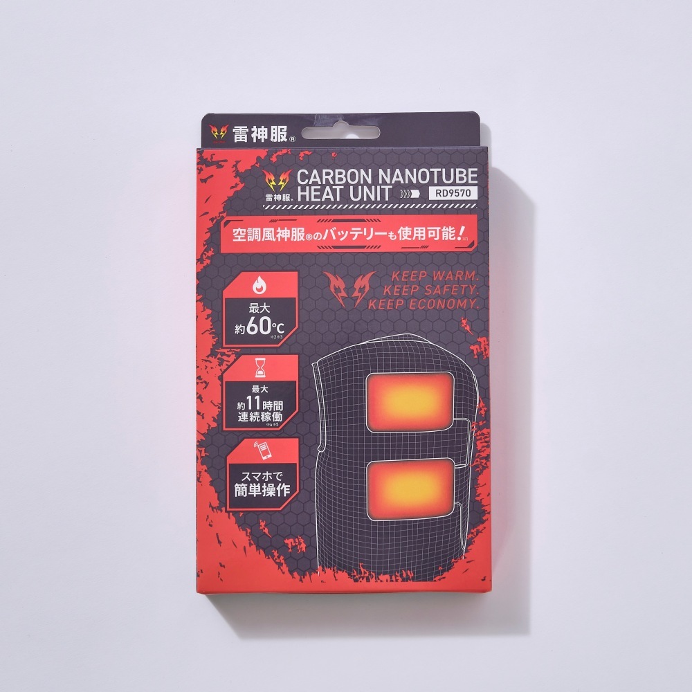 装着する発熱ユニット(RD9570)は、カーボンナノチューブを搭載。スイッチを入れるとすぐに暖かくなり、シート面全体が均一に体を温めてくれます。また、ユニットはやわらかい生地が使われた柔軟な設計(スムース素材)で、軽量なので装着してもかさばりません。