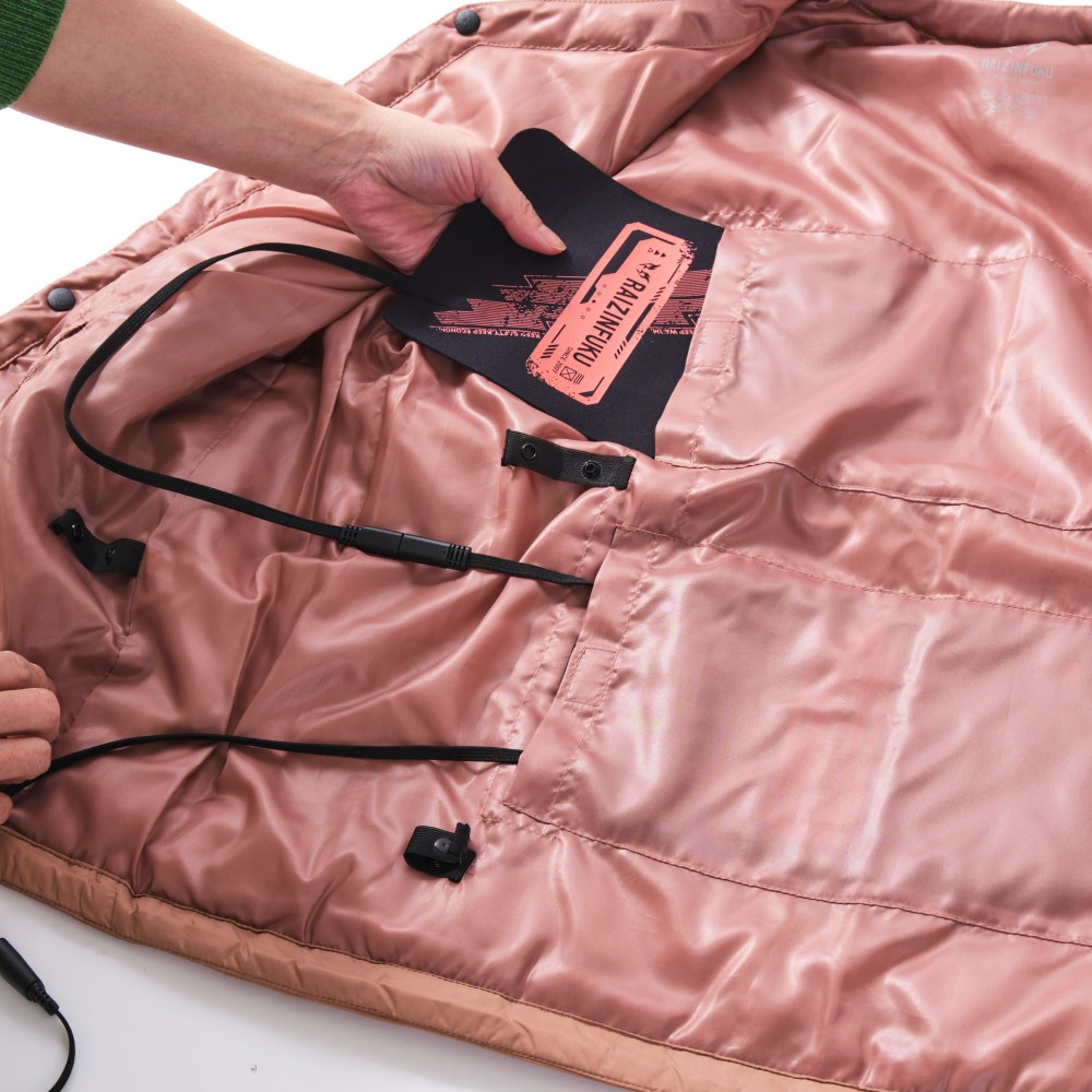 発熱ユニットのセッティングは、背中部分にある2つのポケットにそれぞれシートをセットしてバッテリーをつなぎ、電源を入れるだけで簡単です。