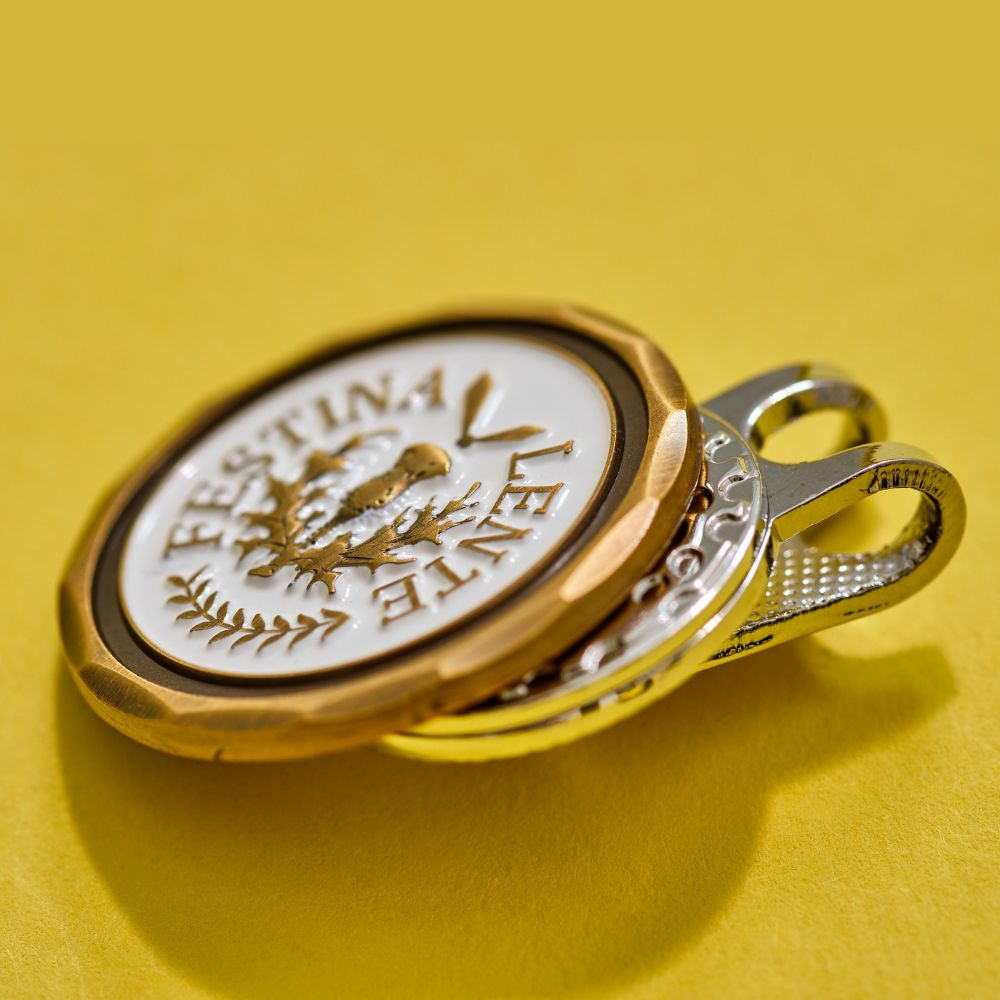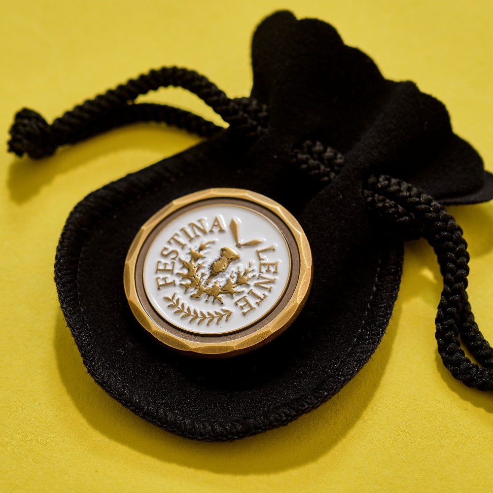 「FESTINA LENTE」ラテン語で「悠々と急げ」の意。スロープレーを戒める命令形の「プレーファスト」でなく、”焦らずともてきぱきとプレーすることでスロープレーはなくなり、自分のゴルフも良い結果になる”という意味が込められています。歴史的な背景と実用性を兼ね備えたアイテムは、ゴルフ通な方への贈り物としても喜ばれます。