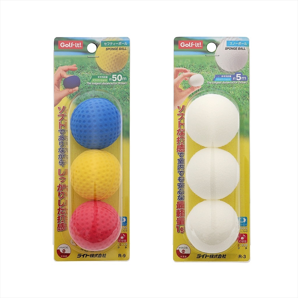 室内練習用のスポンジボール2種をご用意しました。真っ白のほうは「スノーボール」で、なんと最軽量の1グラム! 赤、青、黄の3色カラー「セフティーボール」は、しっかいとした打感があってディンプル付き。どちらも3個入りセットでの販売になります。
