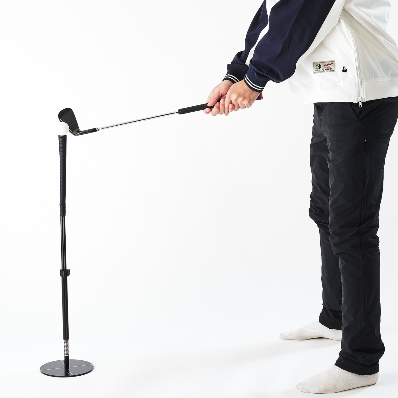 そして、そんなゴルファーの願いを叶える練習器具が、このシンアナ ハイティー。その名の通り、ベルトの高さ、膝の高さ、足首の高さと、段階的に高さを変えられるティーです。