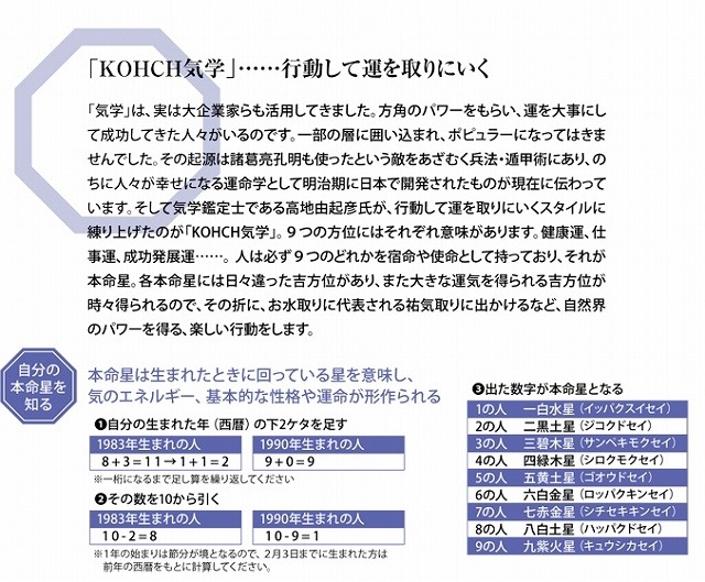 自ら動く人が運をつかめるという、KOHCH気学によるゴルフガイドブックがついているので、仲間のゴルフ運を調べてみるのも楽しい。